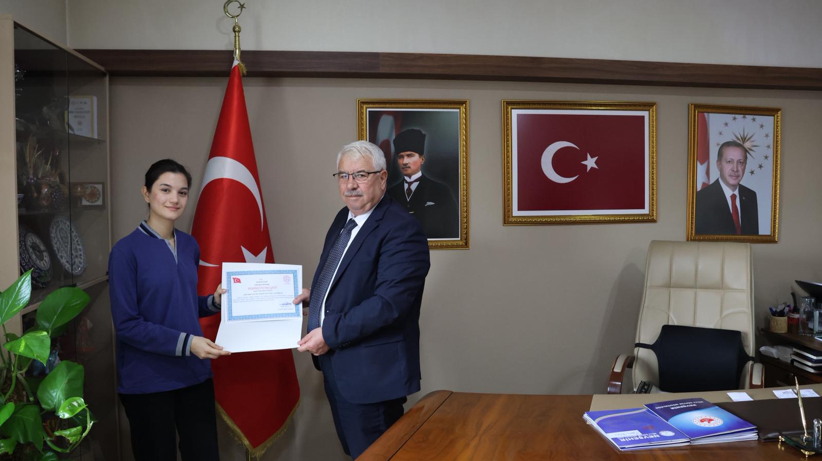 TEKNOFEST 2025'te, yüksek teknik donanım ve keskin bir zekâ gerektiren "Pardus Hata Yakalama ve Öneri Yarışması" kategorisinde finale kalarak Nevşehir'i gururlandıran Nevşehir Şehit Demet Sezen Kız Anadolu İmam Hatip Lisesi öğrencisi Zehra Betül Yüksel ve okul müdürü Mustafa Kılınç, İl Millî Eğitim Müdürü Yusuf Yazıcı'yı ziyaret ettiler.