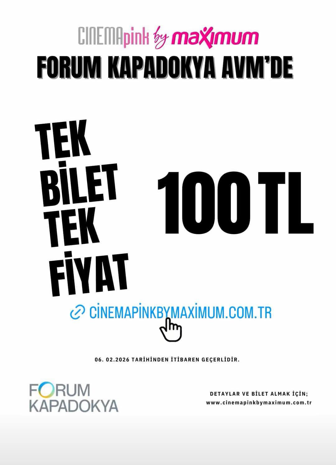 Nevşehir, 10 Şubat 2026 – Forum Kapadokya AVM’deki CinemaPink by Maximum, sinemaseverlere müjdeyi verdi! 6 Şubat 2026’dan itibaren geçerli olan kampanyayla her film, her seans tek bilet sadece 100 TL! Üstelik küçük boy popcorn + içecek menüsü de yalnızca 100 TL, tek popcorn ise 50 TL’ye sunuluyor.