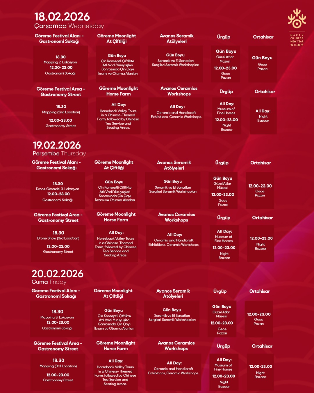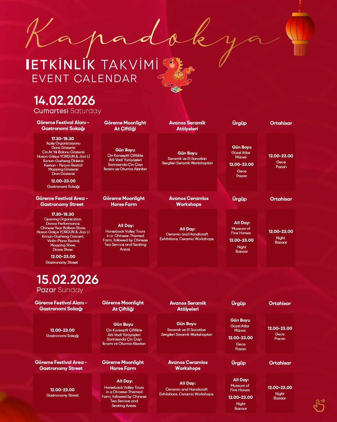 Kapadokya Alan Başkanlığı Bilgilendirme Seminerleri Devam Ediyor: Doğal ve Kültürel Mirasın Korunmasına OdaklanılıyorMerhaba; Kapadokya Alan Başkanlığımız ev sahipliğinde düzenlenecek 2026 Çin At Yılı Kapadokya Etkinlikleri Açılış Töreni, 14 Şubat 2026 tarihinde saat 17.30'da Göreme Etkinlik Alanında gerçekleştirilecektir. Katılımlarınızı bekler, iyi çalışmalar dileriz.