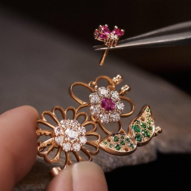 Safirler, çiçeklerin derin mavi tonlarını yansıtırken; ruby'ler, renk paletini zenginleştiren ateşli kırmızı tonlarıyla öne çıkar.